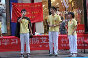湖北学子到五堰街区宣传防艾手语和小话剧表演触…