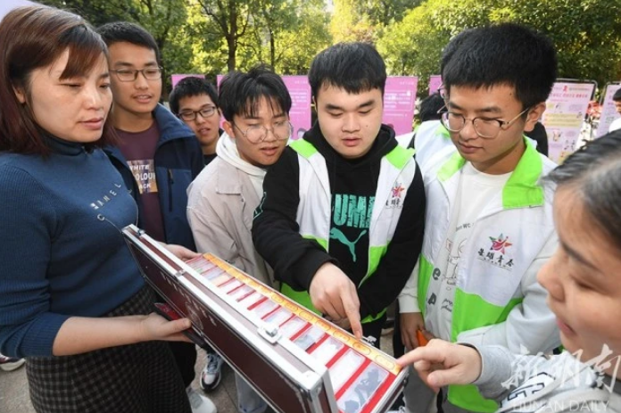 11月25日,湖南机电职业技术学院,志愿者在给大学生讲解毒品的危害。当天,长沙县禁毒防艾宣传进高校活动举…