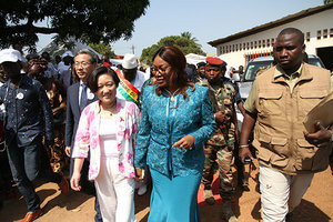 中国驻几内亚大使黄巍偕夫人余慧8日同几内亚总统夫人杰内·孔戴在科纳克里市马塔姆区医疗中心共同主持艾滋…