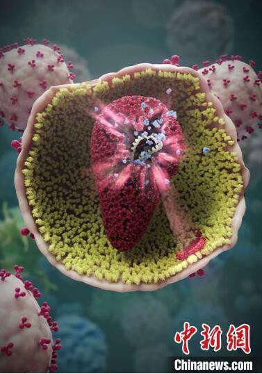 蛋白结合物作用下衣壳(品红色)完整性受破坏的场景,受破坏的衣壳无法继续将HIV基因组(白色)与逆转录酶(…