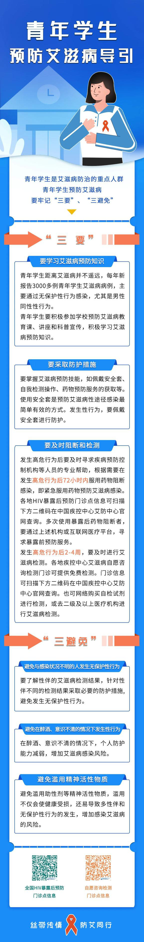 青年学生是艾滋病防治的重点人群,青年学生要积极参加学校预防艾滋病教育课、讲座和科普宣传,积极学习艾滋病预防知识。