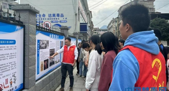 中国禁毒网讯(通讯员周兵权 李亚辉 李臻)10月9日,湖南省安化县古楼乡禁毒宣传志愿者在禁毒文化长廊前教导学生如何辨识新型毒品,安化实现乡乡都有禁毒宣教基地,普及禁毒教育。