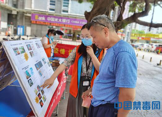活动现场,禁毒社工通过发放禁毒宣传资料的方式,向社区居民讲解禁毒。同时,禁毒社工提醒居民时刻保持警惕,自觉远离毒品。