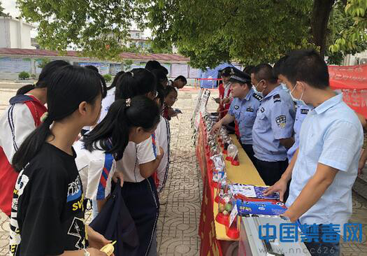 6月16日,派出所民警向学生们展示仿真毒品模型。当日,江西省赣州市经开区三江派出所联合乡综治办、司法所开展禁毒宣传活动。