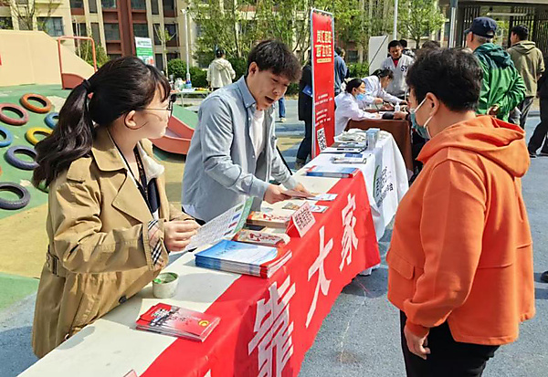 4月29日,东城区体育馆路街道禁毒社工在法华南里社区开展禁种铲毒踏查宣传活动。