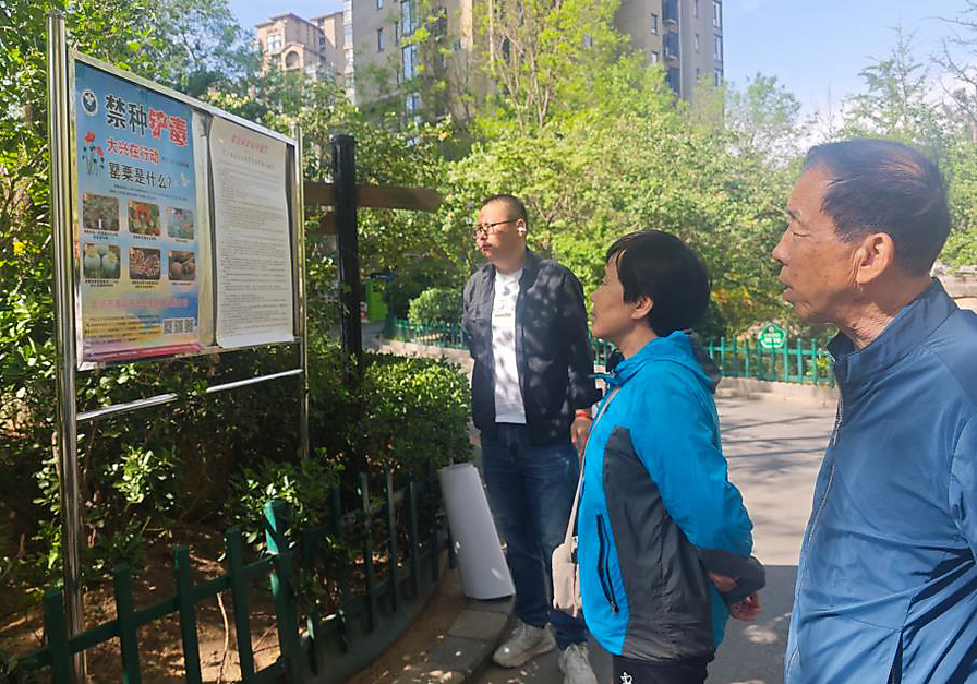 为加强辖区居民禁种铲毒意识,4月24日下午,海淀区紫竹院街道禁毒社工前往理工大学社区居民区,开展毒品原植物踏查及禁种铲毒宣传工作。