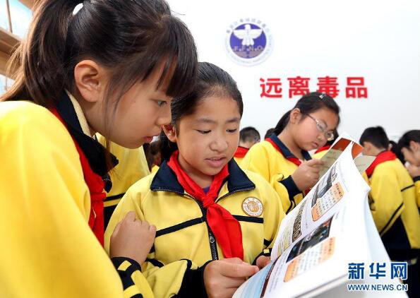 4月24日,学生在上海肇文学校内设立的禁毒基地翻看禁毒宣传手册。 当日,由上海奉贤区奉城镇在肇文学校内设立的禁毒宣传教育基地正式对外开放。该基地具有学生毒品预防教育和社会普及宣传两大职能,通过禁毒展览、禁毒影片、禁毒主题活动等手段,向学生及辖区居民进行禁毒知识普及和毒品预防教育。