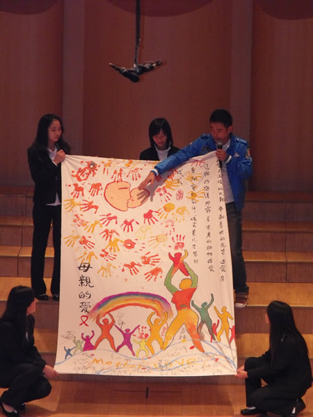 互动游戏后交流会正式开始。首先疾病预防控制中心刘主任致辞,他为大家介绍了国家防艾工作的进展,以及“以爱之名”主题创意大赛的总体情况和进度——从29日起,大赛专家组将对33万余件作品进行评奖;同时强调将“权益、责任、落实”作为今后防艾工作的主题和重点。其后,一位坚强乐观的艾滋病感染者为大家带来了一段VCR,讲述了他因艾滋而陷入痛苦的家庭与他积极投身防艾工作获得的收获。他的团队还制作了一幅巨型图画——《母亲的爱》,以此感谢家庭对艾滋病人的支持。接下来是由社区感染者带来的小品《雨夜》,讲述了一位艾滋病患者因遭歧视而欲自杀,经过主治医师的劝导,重新找到生活下去的勇气的故事。此小品极具震撼力、感染力,全场观众皆为之动容。随后进行的诗歌朗诵和观众互动活动,使大家身临其境地体会到消除歧视,平等相处的重要性。而在之后的访谈节目中,嘉宾周柳建成及艾滋病感染者接受了现场采访和观众提问,使大家更深刻地认识到艾滋病反歧视的重要性,也更加坚定了所有到场观众做好防艾宣传工作的信念。