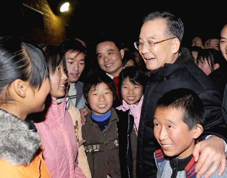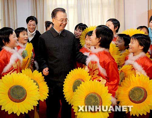 11月30日晚上,温家宝总理来到河南省上蔡县邵店乡新和家园,看望在这里生活的艾滋病致孤儿童 新华社记者李学仁摄