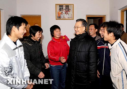 下午5时许,温家宝来到由胡少灵、张萍夫妇和4个孩子组成的家庭。总理拉着孩子们的手进屋坐下,环顾干净整洁的房间,饶有兴趣地询问这个家庭的详细情况:每个孩子的年龄、来自哪个村庄、家里还有什么亲人、学习成绩等等。