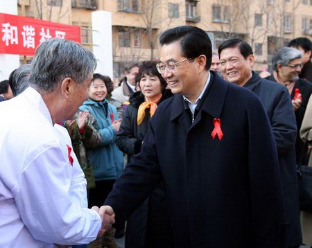 胡锦涛在朝阳区秀水园社区同防治艾滋病专家亲切交谈。新华社记者马占成摄