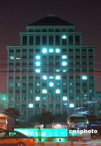 组图:北京校园大楼亮起抗艾灯光标志