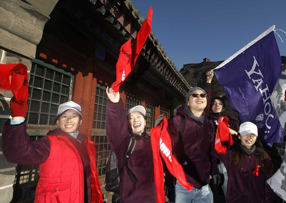 12月2日,寒风凛冽的居庸关长城上出现了一支特殊的宣传队伍。这支宣传队伍由阿里巴巴集团副总裁兼中国雅虎搜索事业部总经理张忆芬率领着上百名雅虎员工组成,原来,他们是在为刚刚走过12月1日的“世界艾滋病日”支持参与“为爱走长城”的公益爱心活动。这支紫色的宣传队伍格外引人注目,他们将与其它来自于慈善组织、企业、高校的志愿者及健走爱好者走一起,在北京居庸关长城步行4公里,呼吁社会各界对艾滋病患者生存状况的关爱。