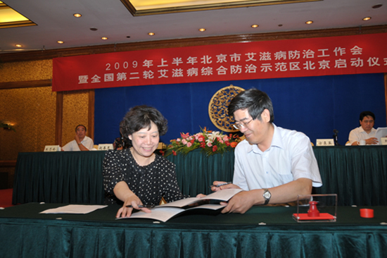 2009年7月9日上午,我市召开了“2009年上半年北京市艾滋病防治工作会暨全国第二轮艾滋病综合防治示范区北京启动仪式”,市卫生局、市公安局、市旅游局、市教委、市发展与改革委员等26个委办局以及18个区县政府组成的市防艾委成员单位的主管领导以及18区县卫生局、疾控中心负责人近110人参加了会议。会上,北京市疾控中心邓瑛主任通报了2009年上半年我市的艾滋病疫情形势;北京市卫生局赵春惠副局长代表北京市防治艾滋病工作委员会总结了2009年上半年北京市防治艾滋病工作并部署了下一步工作重点;国艾办常务副主任、卫生部郝阳副局长介绍了我国艾滋病防治工作开展情况,对我市艾滋病防治工作提出了更高要求;鲁勇副秘书长就本市艾滋病防治工作了重要讲话。会上,市防艾委副主任、市政府鲁勇副秘书长代表市防艾委与西城、海淀、丰台、大兴4个第二轮全国艾滋病综合防治示范区的政府主管区长签订了责任书。