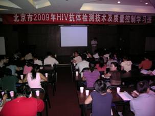 本次会议于2009年8月6日-7日在西直门北大街天方饭店举办,实际参会人员加工作人员总计206人,整个会议包括五个专题报告,分别是孙伟东报告的“艾滋病检测实验室的质量控制与评价”、张启云报告的“艾滋病实验室安全及事故紧急处理”、陈强报告的“艾滋病抗体检测方法”、白立石报告的“艾滋病检测质量保证与北京市管理和技术规范细则”及叶景荣报告的“HIV感染辅助诊断技术介绍”。会议结束前为了检验学员的学习效果,还组织了一次20分钟的测验,会议结束后,给达到培训要求的学员颁发了HIV抗体初筛检测上岗证,所有受训学员计继续教育学分4分。