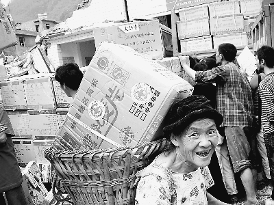 汶川地震发生后,来自全国各级红十字会的救援物资源源不断地运抵灾区。图为四川省阿坝藏族羌族自治州的藏族同胞领取山西省红十字会提供的救灾物资。
