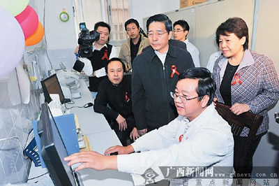 12月2日下午,自治区党委书记、自治区人大常委会主任郭声琨佩戴着红丝带,来到自治区疾控中心艾滋病抗病毒治疗门诊,看望战斗在防艾一线的医务人员和青年志愿者,并对广西艾滋病防治工作作出重要指示。 记者刘宇 摄
