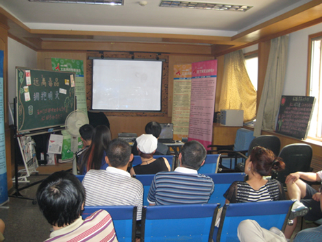 进入会议室,由治疗者自己设计出版的黑板报,醒目的题目映入人们的视线“远离毒品,拥抱明天”,各种宣传手册贴在上面,疾控发给门诊防艾知识的展板放在醒目的位置上,室内非常安静,大家仔细的观看宣传片。