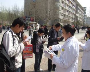 2011年4月,由济南市疾控中心性病艾滋病防治研究所承担的青年学生国家级艾滋病监测哨点正式启动,至此,济南市已有6个国家级艾滋病监测哨点,监测人群涉及性病门诊男性就诊者、暗娼、孕产妇、男男性行为者、肾透析、青年学生等六类人群。4月8日,为做好青年学生哨点监测工作,济南市疾控中心积极探索新的工作模式,在中心团委的大力支持下,与济南大学青春无悔志愿者组织一起,在济南大学校园内开展了“预防疾病-关注健康”大型宣传活动。济南市疾控中心以此为平台,积极宣传春季流行病与艾滋病防治知识,同时,抓住时机,努力完成2011年哨点监测任务。工作中,大家不辞辛苦,以饱满的工作热情对在校大学生开展青年学生问卷调查和血清学检测,活动当天完成了300余份的青年学生问卷调查和血清学检测工作,为完成今年800人份的哨点监测任务迈进了可喜的一步,同时也为今年顺利完成国家级艾滋病哨点监测工作奠定了基础。