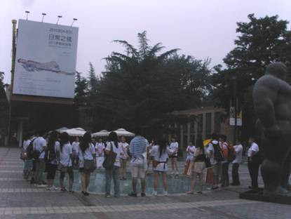 九点半外展正式开始,各组组员按照事先分好的路线行进。营员们一边欣赏各式各样的艺术品,一边积极的寻找游客。在寻找游客的空挡,中国营员便抓紧时间向日本和韩国学生教授有关预防艾滋病的知识。“蚊虫叮咬能传播艾滋病吗?”中国学生一字一句地教授,外国学生生涩的发音虽然闹了不少笑话,但大家的热情丝毫未减。活动鼓励中国学生引导外国大学生与游客交流,他们经过几天的相处,营员之间已经培养了不少默契,纵使语言交流还存在障碍,但一个小小的举动、一个微微的动作也能准确传达。一次宣传结束后,营员会赠给游客笔、便签、钥匙挂饰之类的纪念品,在游客同意的情况下用相机记录他们的微笑,将这份红十字精神记录并传递下去。
