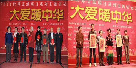 本次2011世界艾滋病日主题系列活动包含“水墨丹青绘大爱”慈善竞买和“大爱暖中华”---2011世界艾滋病日主题晚会。其中晚会由全国工商联和国务院防治艾滋病工作委员会办公室联合主办,由中华红丝带基金承办,中国光彩事业基金会、北京水星轩书画艺术有限公司和迪瑞康国际文化传媒协办。“水墨丹青绘大爱”慈善竞买活动所有竞买品将于11月28日在石景山万达铂尔曼大饭店进行预展,11月29日在万达铂尔曼大饭店进行竞买。据悉,这是中华红丝带基金第二次通过“义捐、竞买”的形式为防治艾滋病募集善款,此次募集的善款主要用于四川省凉山州艾滋病母婴阻断事业。全国政协副主席、全国工商联主席黄孟复曾提出,企业家可以用真金白银献出他们的爱,艺术家可以用他们的作品献出他们的爱,希望大家有钱的出钱,有力的出力,有智慧的出智慧。谢经荣副主席启动仪式上指出,全国工商联、中华红丝带基金不是专业的医疗卫生机构,但一直在艾滋病防治方面坚持不懈的战斗,并且敢于去啃“硬骨头”,最根本的原因,是出于对每一个生命的尊重。“水墨丹青绘大爱”,这一主题描绘的正是社会主义和谐社会美好画卷。发布会现场,爱心艺术家代表王又凯、王翰尊、张瑞祥、邓学来、李鸿翔和爱心企业豪德集团、圣奥集团、汉能集团的代表都现场做出承诺,将把自己的作品和善款捐献给红丝带基金,用于凉山州艾滋病防治的各项事业中。来自凉山州的大学生曲比尔莲现场向企业家赠送中华红丝带基金凉山州栋梁班孤儿的绘画作品,以表达他们凉山人民对社会各界关心支持的感恩之情。