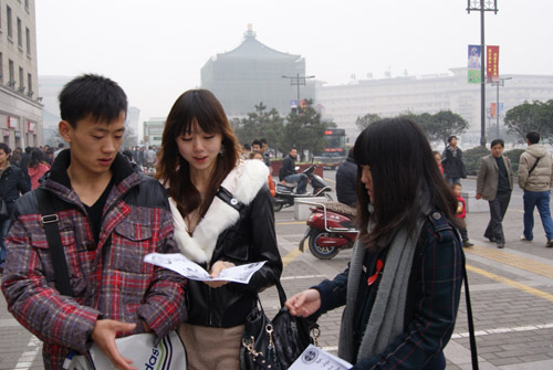 11月27日下午,由陕西师范大学和西北工业大学数十名学生志愿者组成的宣传队,走到钟楼邮局广场和大雁塔北广场,开展第24个世界艾滋病日宣传活动。志愿者们站在寒风中向往来行人发放宣传材料和防艾用具,热心介绍艾滋病的医学原理和防治知识。