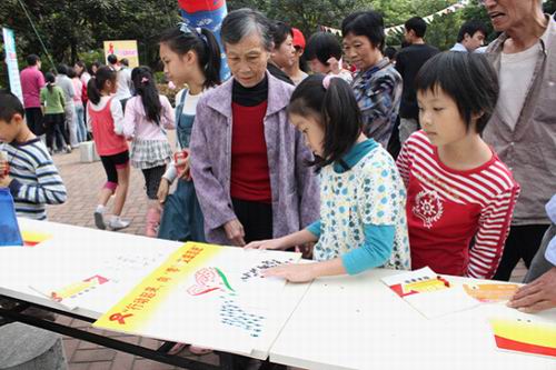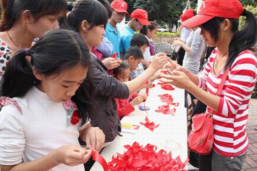 2011年12月1日是第24个“世界艾滋病日”,本次活动是在高新苑小区中心花园举行,参与活动的主要人群由社区居民和青年志愿者组成。通过倡议签名、现场咨询、制作红丝带、猜字谜、拼图、套圈、蒙眼点红丝带上方空的地方和要口令等游园活动,来加强和认识防艾知识。