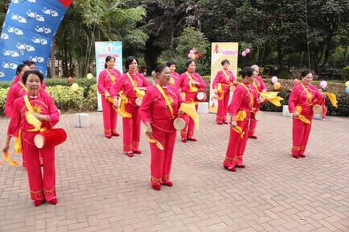 11月27日,广西中医学院附属瑞康医院深入高新工业社区开展“行动起来 向‘零’艾滋迈进” 宣传防治艾滋病知识,社区居民组成的敲鼓队。