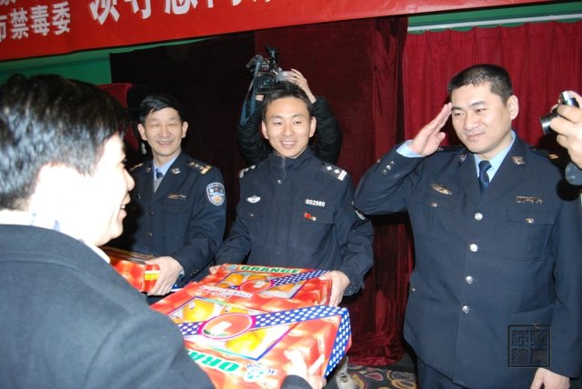 公安部禁毒局副局长、国家禁毒办副主任陈绪富发表讲话,对北京市的禁毒工作予以了充分的肯定,并代表国家禁毒办向大家拜年。随后与会领导向首都一线禁毒干警和禁毒志愿者发放了慰问品,并和大家合影。