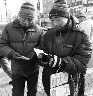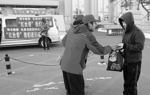 长春市西三马路银泰百货门前,这里每天都聚集着好多提着通下水、修水暖、刮大白、力工等牌子的打零工的,男男女女老老少少多大岁数的都有。昨日10点多,“红丝带”志愿者的出现顿时搅热了这里的空气,原本寒风中端着膀子,插着袄袖等活的人们全都凑了过来,“不要钱,发东西了,老张快去瞅瞅。”大家伙说着凑了过来。“知道今天啥日子吗?”一志愿者问,现场的很多人摇头,表示不知道。