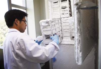 22日,中国疾病控制中心艾滋病疫苗实验室,工作人员在零下80摄氏度的冰柜中取研制中的疫苗。