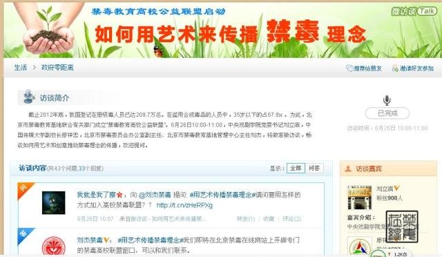 6月26日上午10:00-11:00中央戏剧学院党委书记刘立滨、中国传媒大学副校长廖忠祥和北京市禁毒委员会办公室副主任、北京市禁毒教育基地管理中心主任刘杰共同在北京市禁毒教育基地网络直播间进行新浪“微访谈”,通过新浪微博与网友互动,共同探讨禁毒教育高校公益联盟的意义和工作内容,以及如何用创意和艺术传播禁毒理念,弘扬禁毒文化。(杨彬/摄)