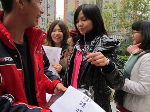 北京林业大学青春红丝带社团志愿者在校团委的指导下先后针对校内保安、保洁、餐饮、宿管等后勤服务人员,富润家园社区居民及社区务工青年等群体开展了“红丝带健康包”百校进千企活动,通过填写调查问卷、发放明信片、征集12·1寄语、发放健康包等形式吸引社区居民,使居民们加深了对艾滋病的发病原理、传播途径和有效预防艾滋病的了解。