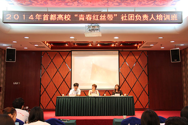 在培训班开班仪式上,团市委权益部部长李海娟为参加培训班的大学生赠送了培训教材并全程听取了我市艾滋病防治工作专题报告,她希望各高校“青春红丝带”社团负责人进一步加强大学生防艾社团的规范化建设,加大防艾宣传教育工作力度,有效遏制艾滋病在校园的蔓延。北京市性病艾滋病防治所所长卢红艳结合我市艾滋病流行形势,为给高校社团负责人举办了艾滋病防治知识专题讲座。参加培训班的全体同学经过三天的培训和宣教试讲,均获得团市委颁发的防艾宣传教育师资证书。