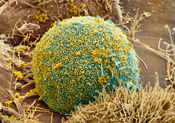 白细胞上的艾滋病毒(黄色颗粒),扫描电镜照片。(《自然》杂志官网图片)Thomas Deernick,NCIMR/Science Photo Library