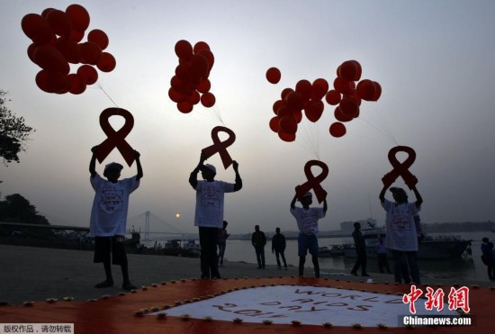 在印度加尔各答,志愿者们举起红丝带,放飞红色气球,宣传世界艾滋病日。