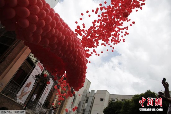 巴西圣保罗市放飞红色气球。