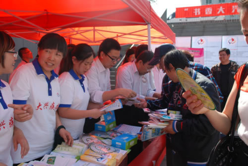 2016年4月23日是第23个世界读书日,按照全市统一部署,北京阅读季全城尚读大幕全面拉开,涉及历史、人文、科学、生活各个领域。大兴区作为分会场之一,开展了以“阅季花开、书香大兴”为主题的全民悦读汇活动。为进一步提高全民防艾意识,贯彻落实《2016年北京市性病、艾滋病防治工作要点》,切实做好2016年度全区艾滋病防控工作,按照市、区相关工作要求,区疾控中心借助“悦读汇”这一平台于4月21日下午在图书馆广场开展了艾滋病防治专项宣传活动,区疾控中心、区人民医院相关领导和专业人员参加了此次活动。