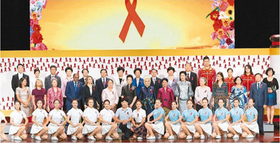 最后,彭丽媛同来宾们在中国卷轴造型的签名板上贴上红丝带,共同表达对防治和抗击艾滋病的坚定支持和共同期待。