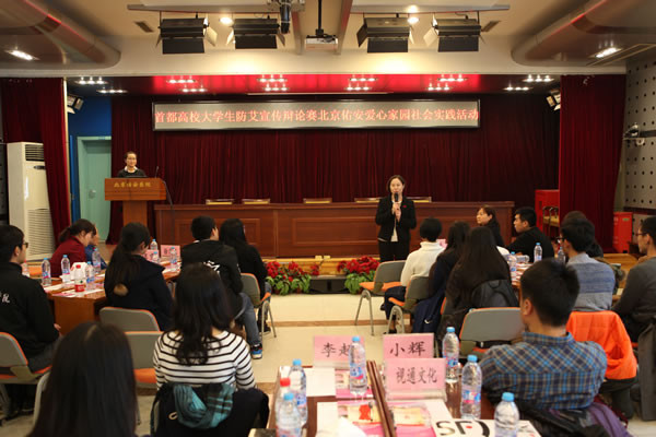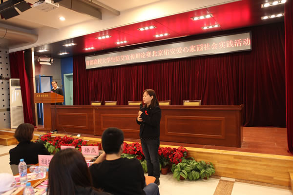在地坛医院红丝带之家内,参赛大学生、工作人员和志愿者们齐聚一堂,首先由市防艾办、市卫生计生委疾控处徐征老师介绍了活动背景及意义,呼吁学生积极参与防艾社会实践活动,增长知识、累积经验;随后,红丝带之家办公室主任王克荣介绍了红丝带之家的发展历程,肩负使命及奋斗目标;中国预防性病艾滋病基金会刘京徽副理事长介绍基金会发展概况;团委书记李晶重点介绍了2+1红丝带高校行项目并邀请2+1团队志愿者表演了情景剧传播防艾知识、讲述爱心故事,分享感动;最后参赛大学生和防艾志愿者一起交流防艾心得,剖析辩题题目。