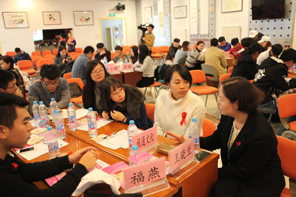 佑安医院报告厅内,北京市疾病预防控制中心性艾所卢红艳所长,北京佑安医院感染中心徐莲芝主任、王晓兰总护士长,爱心家园福燕护士长对各位同学的到来表示了欢迎,希望各参赛队在此次社会实践中有所学,有所得,在今后的防艾事业中发挥更加积极的作用;随后,福燕护士长介绍了爱心家园的发展历程;志愿者黄涛分享了志愿工作经验和感受;志愿者王立强分享了防艾技巧;相关医务人员、志愿者、学生根据各自辩题开展了分组交流座谈,各参赛队热情高涨,积极讨论。最后,各参赛队在志愿者的带领下参观了爱心家园。