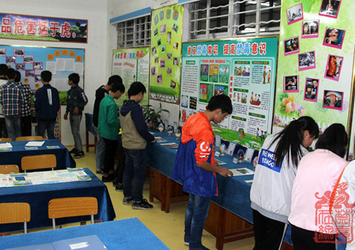 广西大学研支团从打造一个毒品预防教育基地入手,把富川一中禁毒教室设计规划为教学园地、模型展示、科普墙报和成果剪影4个部分,设置毒品科普知识展览、禁毒知识小报、传统和新兴毒品模型、毒品吸食工具模型和签名墙。依托毒品预防教育基地与富川一中政教处联合开展毒品预防教育活动:上一堂毒品防范教育课,举行一场禁毒宣誓签名仪式,举办一次禁毒征文(书法、手抄报等)比赛,组织学生参观一次毒品科普知识展览。让学生通过自主阅读、实例讲解、观察反思等多方面认识毒品的危害。“禁毒教室里的毒品模型十分生动形象,让我很直观地认识了各种毒品的样子及危害”,一位刚参观完禁毒展览的同学这样说道。
