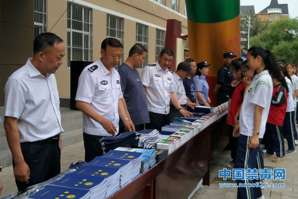 图为黑河市政府党组成员、市公安局党委书记、局长、市禁毒委副主任邓福才(左二)为学生发放禁毒宣传材料。中国禁毒网发
