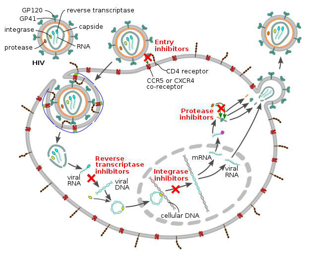 (4种药物分别在HIV复制传播链条的不同环节起作用,以达到阻断HIV复制增殖的途径,因此三管齐下、四管齐下的“鸡尾酒疗法”是现今治疗HIV感染最有效的手段)