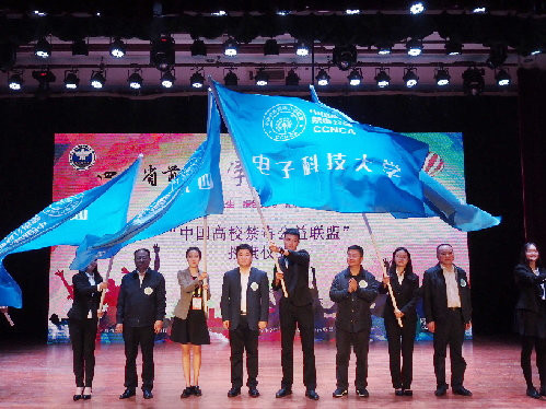 图为与会领导为加入中国高校禁毒公益联盟的高校代表授旗。