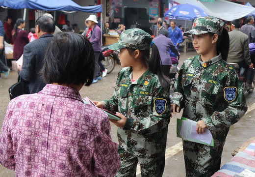 活动第二阶段,禁毒小卫士们首先带着家长们来到三洲中心校的禁毒宣教室参观,向家长们宣传禁毒知识,然后两两分组,在集市上分发禁毒宣传单,强调毒品的危害,呼吁三洲镇的乡亲们远离毒品。最后,几名禁毒小卫士来到了三洲镇派出所,采访了警察叔叔,了解三洲镇的禁毒工作情况。