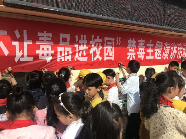 活动中,学生代表上台演讲,并由校长对学生们的演讲做指导点评并颁发奖状。活动结束后,禁毒办工作人员引导学生们宣誓并签名。此次活动,共发放各类禁毒宣传资料1000余份。