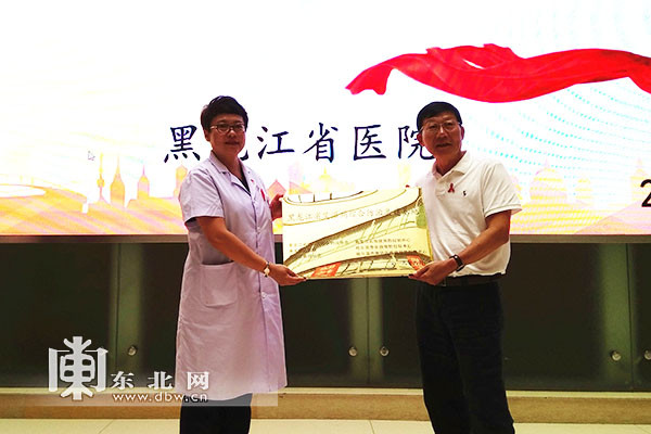 黑龙江省性病艾滋病防治协会会长邢济春(右)向省医院党委书记王亦冬授牌。