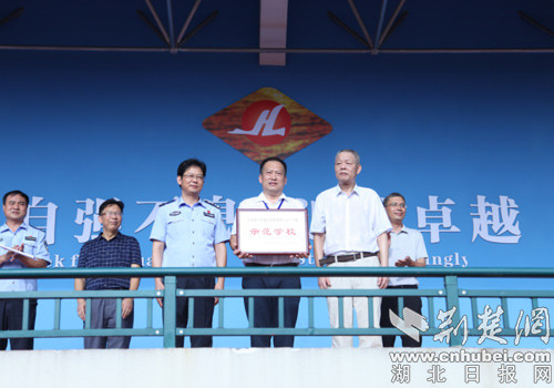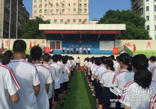 活动中,东宝区禁毒办主任、东宝公安分局党委委员贾红星宣读了国家禁毒办《关于对全国青少年毒品预防教育“6?27”工程示范学校、优秀教师和优秀校外辅导员予以表扬的通报》,并要求受到表扬的示范学校、优秀教师和优秀校外辅导员要珍惜荣誉、再接再厉,发挥典型示范引领作用,继续深入做好青少年毒品预防教育工作。随后,荆门市禁毒办副主任、市公安局禁毒支队支队长王才富与市禁毒委员会委员、市教育局党委委员、市政府教育督导室副主任郑万学将全国青少年毒品预防教育“6?27”工程示范学校的奖牌授予给了海慧中学校长张勇。最后,全校学生进行了禁毒宣誓,并到该校的毒品教育室进行了参观学习。