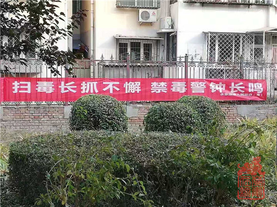 为进一步加大永乐店镇禁毒宣传力度,增加辖区居民群众对毒品危害的认知度,提高辖区居民识毒、防毒、拒毒的意识和能力,2018年11月2日,通州区永乐店镇禁毒社工在永乐嘉园小区、永乐店镇商业街等镇域内繁华路段以悬挂横幅进行禁毒宣传活动。